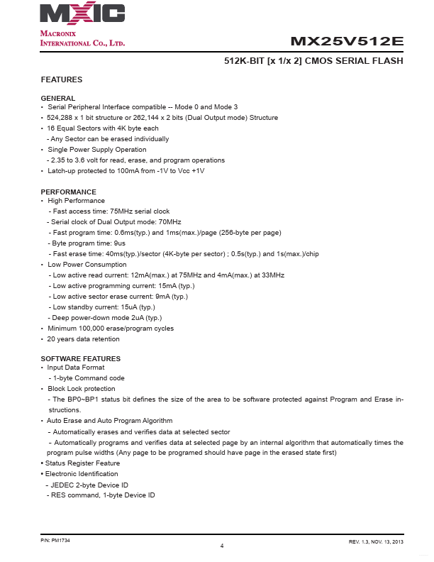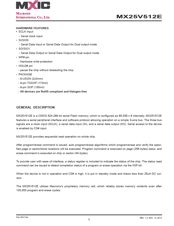 MX25V512E is a CMOS 524,288 bit serial Flash memory, which is configured as 65,536 x 8 internally.