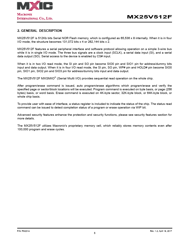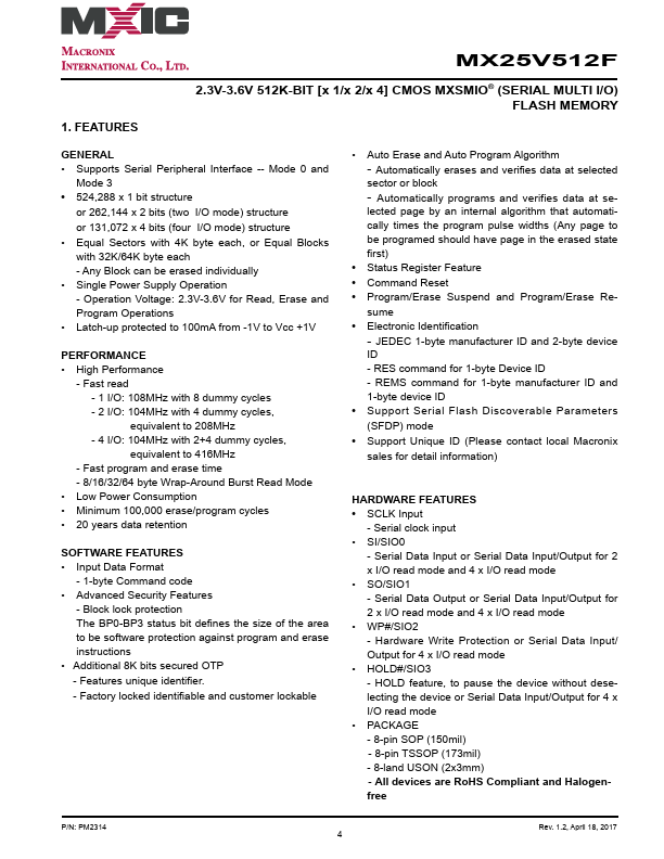 MX25V512F MX25V512F 2.3V-3.6V, 512K-BIT [x 1/x 2/x 4] CMOS MXSMIO® (SERIAL MULTI I/O) FLASH.
