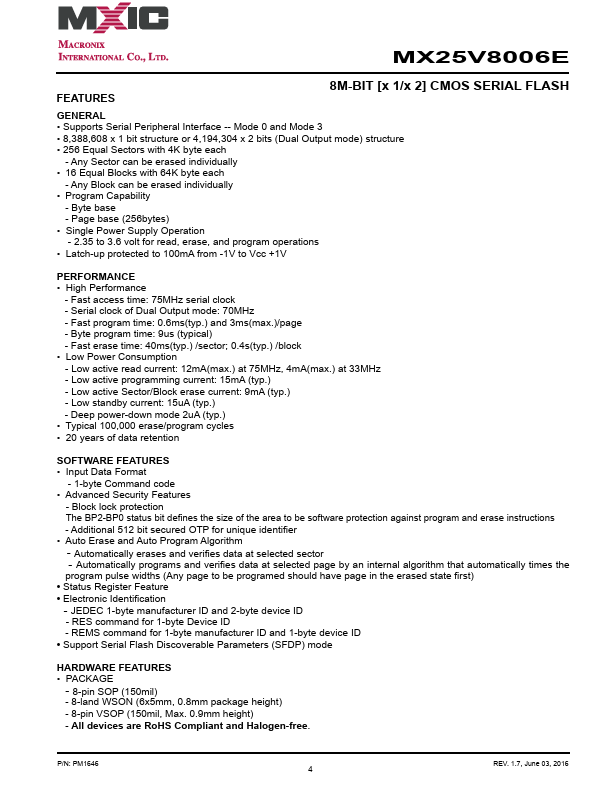 - 2.35 to 3.6 volt for read, erase, and program operations