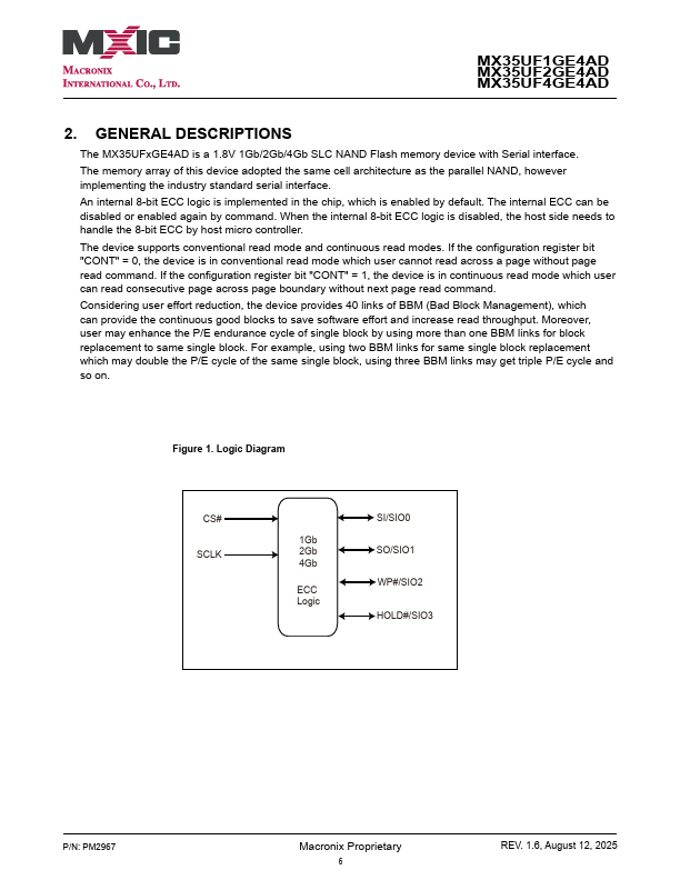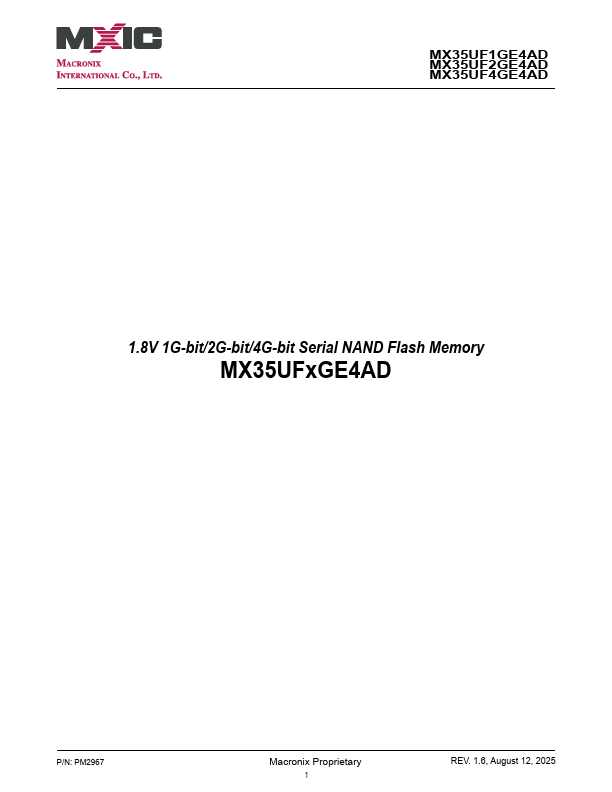 MX35UF1GE4AD MX35UF2GE4AD MX35UF4GE4AD 1.8V 1G-bit/2G-bit/4G-bit Serial NAND Flash Memory MX35UFxGE4AD P/N: PM2967 Macronix Proprietary 1 REV.