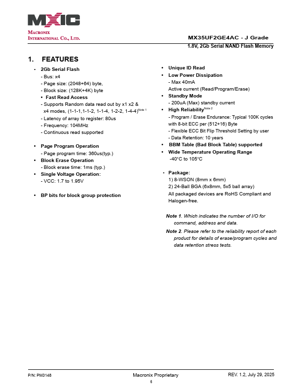 MX35UF2GE4AC - J Grade 1.8V, 2G-bit Serial NAND Flash Memory MX35UF2GE4AC J Grade P/N: PM3148 Macronix Proprietary 1 REV.