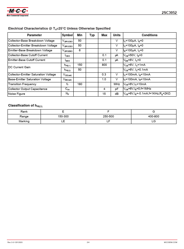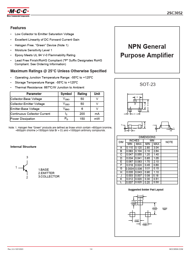 • Excellent Linearity of DC Forward Current Gain • Halogen Free. “Green” Device (Note 1) • Moisture Sensitivity Level 1 • Epoxy Meets UL 94 V-0 Flammability Rating • Lead Free Finish/RoHS Compliant ("P" Suffix Designates RoHS