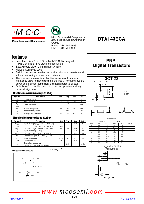 DTA143ECA | PNP Digital Transistors | SeCoS |