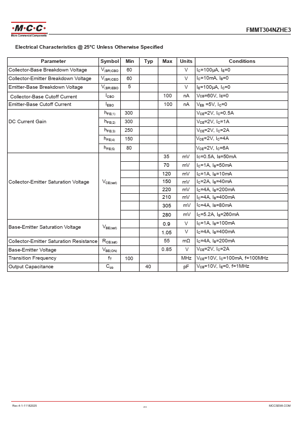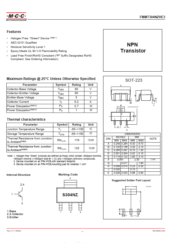 Note: 1. Halogen free "Green” products are defined as those which contain <900ppm bromine, <900ppm chlorine (<1500ppm total Br + Cl) and <1000ppm antimony pounds. 2. Device mounted on an FR4 PCB,with standard footprint. 3. Device mounted on an FR4 PCB,mounting pad for collector 1 cm².
