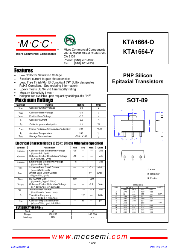 KTA1664 | PNP Epitaxial Planar Transistors | WEITRON |
