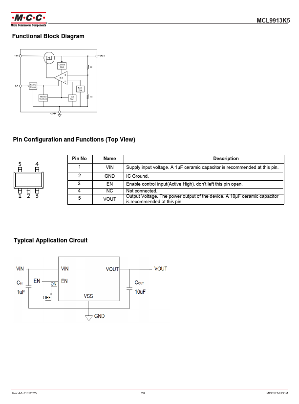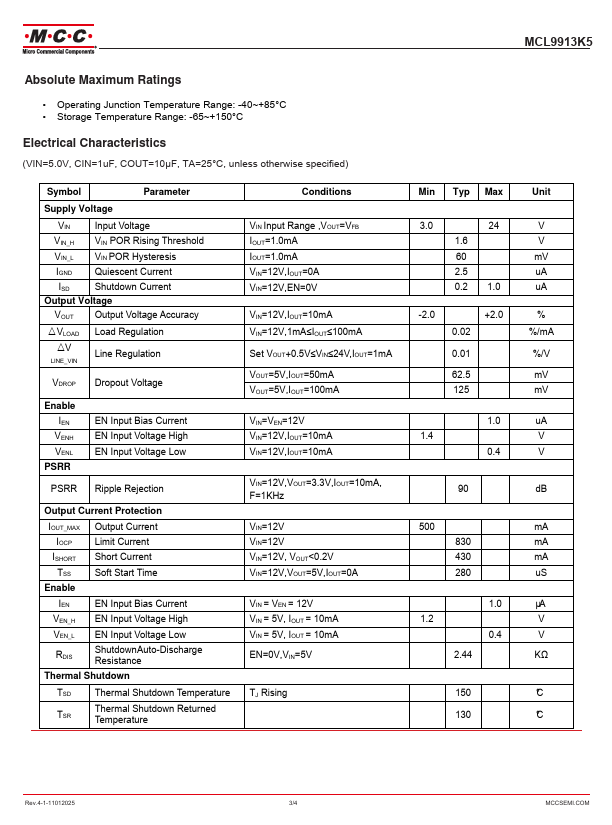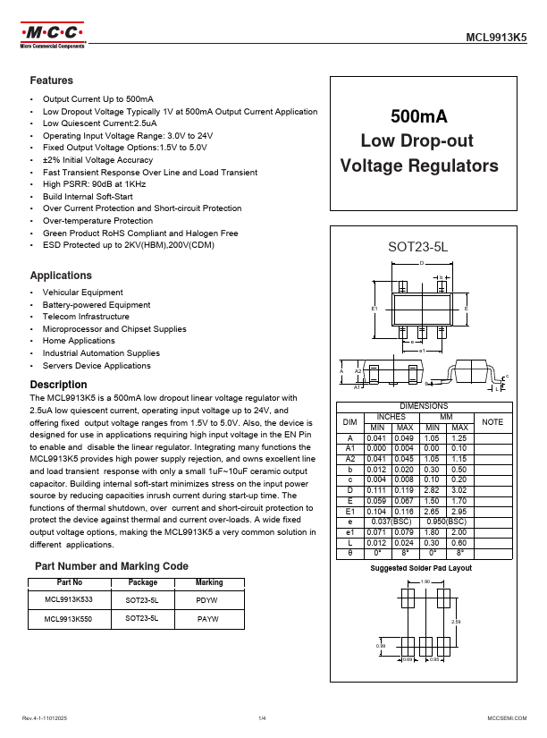 The MCL9913K5 is a 500mA low dropout linear voltage regulator with 2.5uA low quiescent current, operating input voltage up to 24V, and offering fixed output voltage ranges from 1.5V to 5.0V.