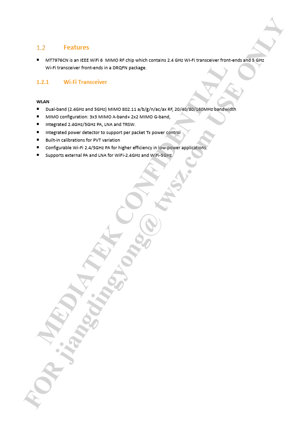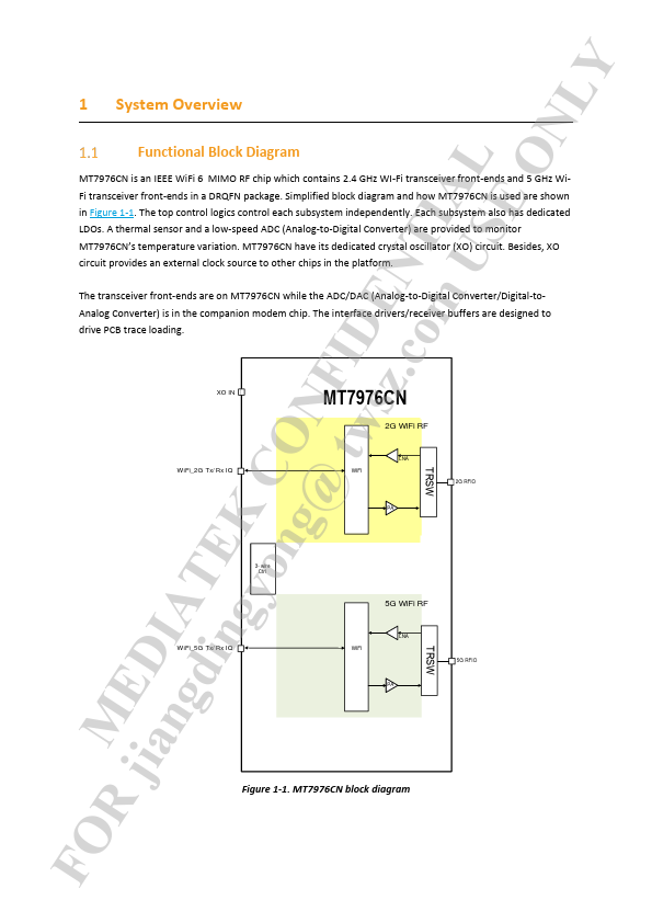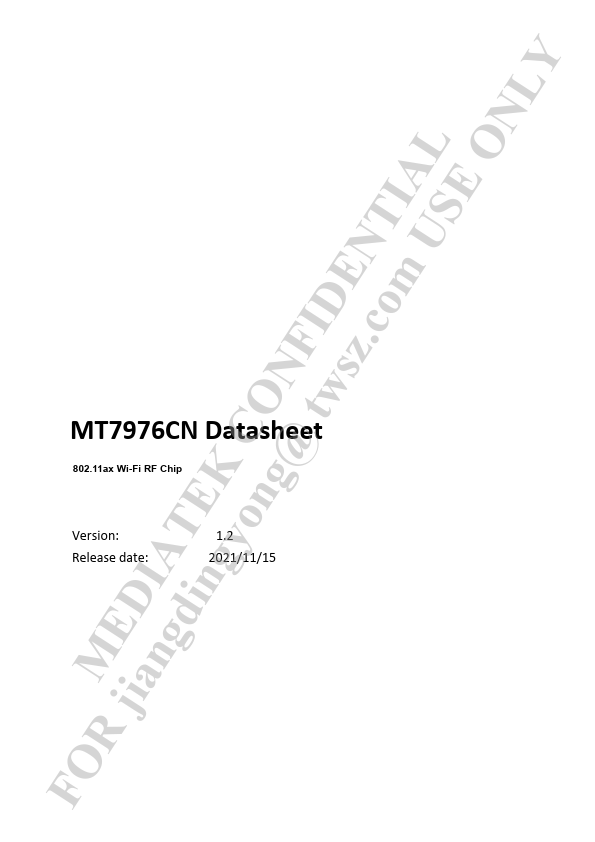FOR jianMgEdiDIngAyToEngK@CtOwsNz.FIcoDmENUTSIEALONLY MT7976CN Datasheet 802.11ax Wi-Fi RF Chip Version: 1.2 2021/11/15 FOR jianMgEdiDIngAyToEngK@CtOwsNz.FIcoDmENUTSIEALONLY 1 System Overview Functional Block Diagram MT7976CN is an IEEE WiFi 6 MIMO RF chip which contains 2.4 GHz WI-Fi transceiver front-ends and 5 GHz WiFi transceiver front-ends in a DRQFN package. Simplified block diagram and how MT7976CN is used...