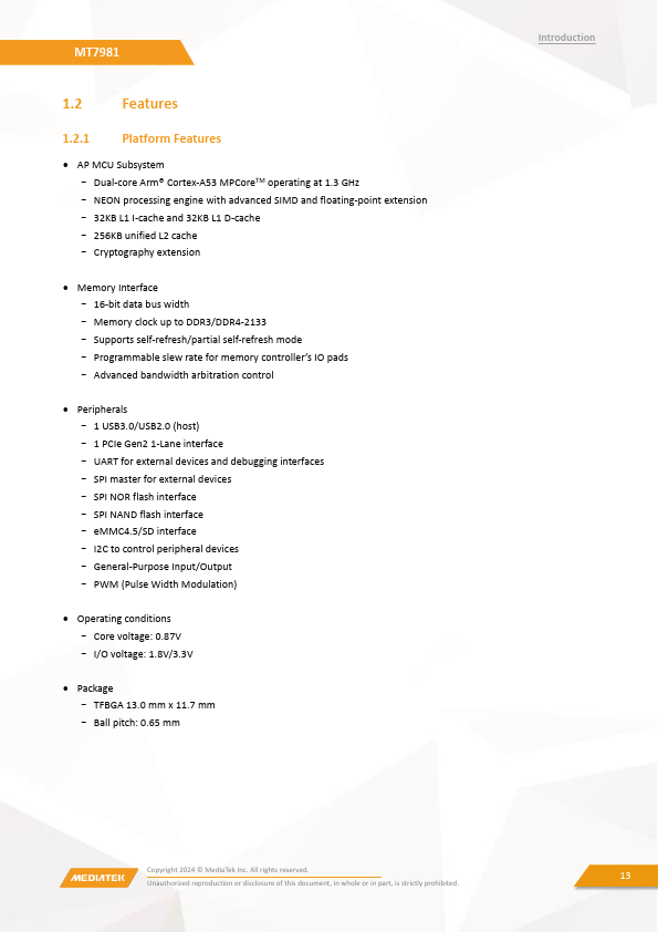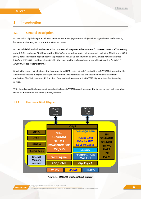 MT7981B is a highly integrated wireless network router SoC (System-on-Chip) used for high wireless performance, home entertainment, and home automation and so on. MT7981B is fabricated with advanced silicon process and integrates a dual-core Arm® Cortex-A53 MPCoreTM operating up to 1.3 GHz and more DRAM bandwidth. This SoC also includes a variety of peripherals, including SGMII, and USB3.0 (host) ports.