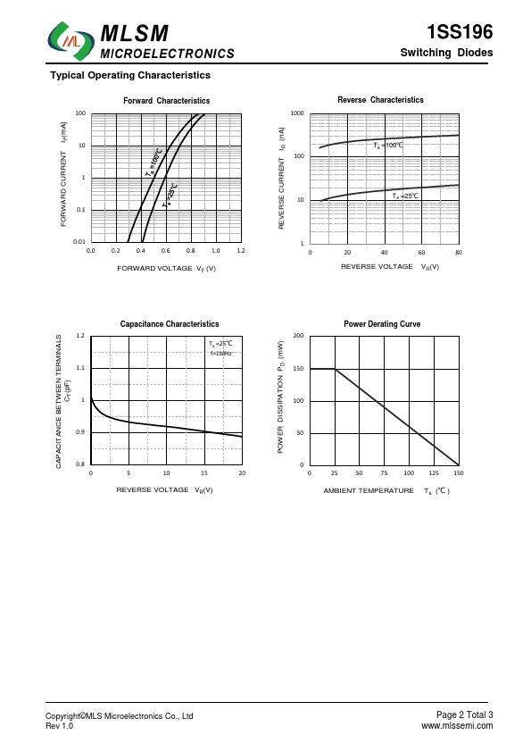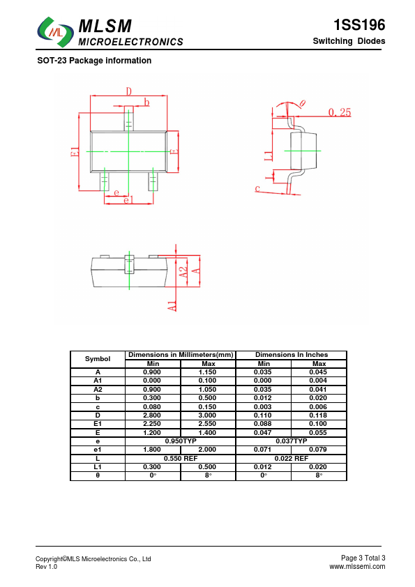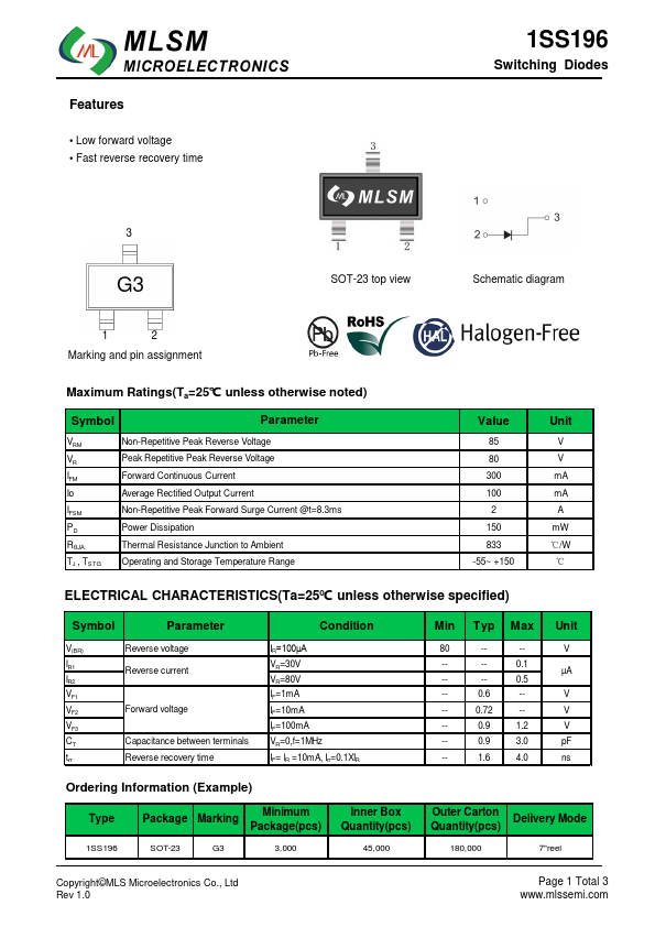 Features Low forward voltage Fast reverse recovery time 1SS196 Switching Diodes 3 G3 SOT-23 top view Schematic diagram 1 2 Marking and pin assignment Maximum Ratings(Ta=25℃ unless otherwise noted) Symbol Parameter VRM VR IFM Io IFSM PD RθJA TJ , TSTG.