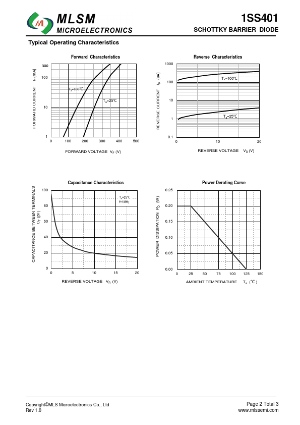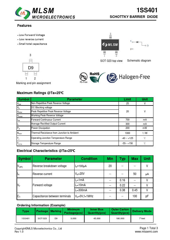 Features Low Forward Voltage Low reverse current Small total capacitance 1SS401 SCHOTTKY BARRIER DIODE 3 SOT-323 top view Schematic diagram D9 1 2 Marking and pin assignment Maximum Ratings @Ta=25℃ Symbol Parameter VRM VR VRRM VRWM IFM Io Non-Repetitive Peak.
