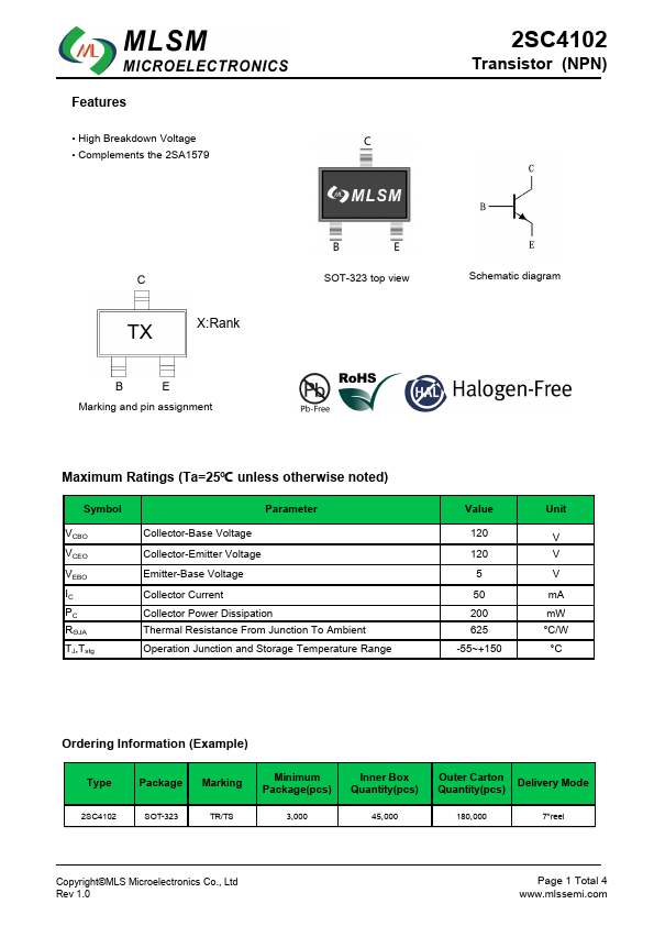 Features • High Breakdown Voltage • Complements the 2SA1579 2SC4102 Transistor (NPN) C TX X:Rank B E Marking and pin assignment SOT-323 top view Schematic diagram Maximum...