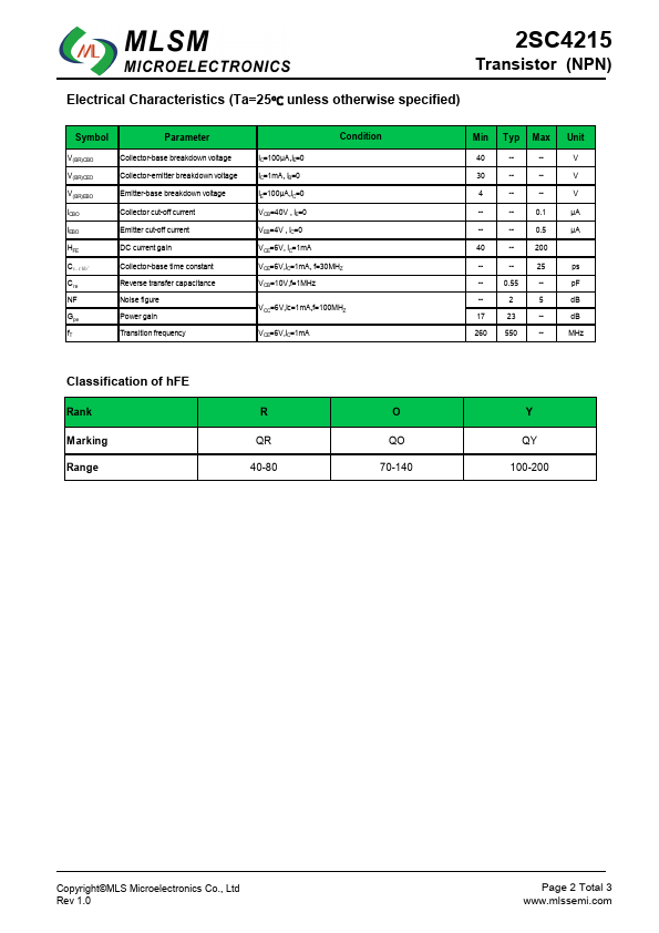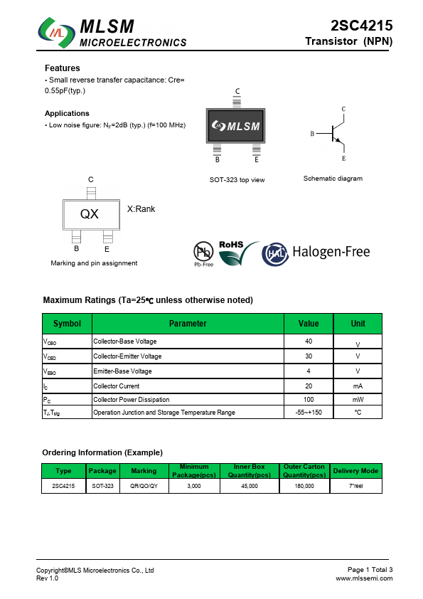 =2dB (typ.) (f=100 MHz) 2SC4215 Transistor (NPN) C QX X:Rank B E Marking and pin assignment SOT-323 top view Schematic diagram Maximum Ratings (Ta=25℃ unless otherwise noted) Symbol VCBO VCEO VEBO IC PC TJ,Tstg Parameter Collector-Base Voltage Collector-Emitter Voltage Emitter-Base Voltage Collector Current Collector Power Dissipation Operation Junction and Storage Temperature Range Value Unit 40 V 30 V 4 V 20 mA 100 mW -55~+150 °C Ordering Information (Example) Type 2SC4215 Package SOT-323 Marking QR/QO/QY Minimum Package(pcs) 3,000 Inner Box Quantity(pcs) 45,000 Outer Carton Quantity(pcs) 180,000 Delivery Mode 7"reel Copyright©MLS Microelectronics Co.