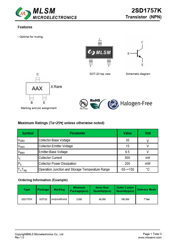 Features • Optimal for muting. 2SD1757K Transistor (NPN) C AAX X:Rank B E Marking and pin assignment SOT-23 top view Schematic diagram Maximum Ratings (Ta=25℃ unless othe...