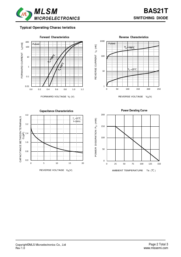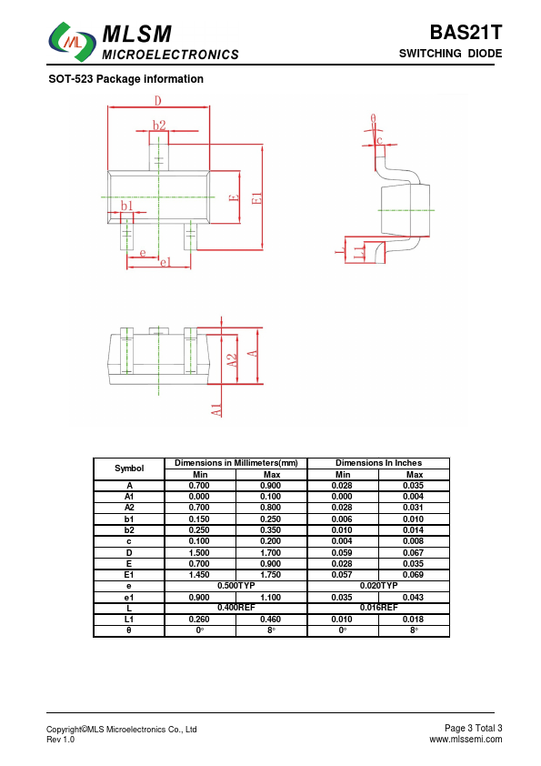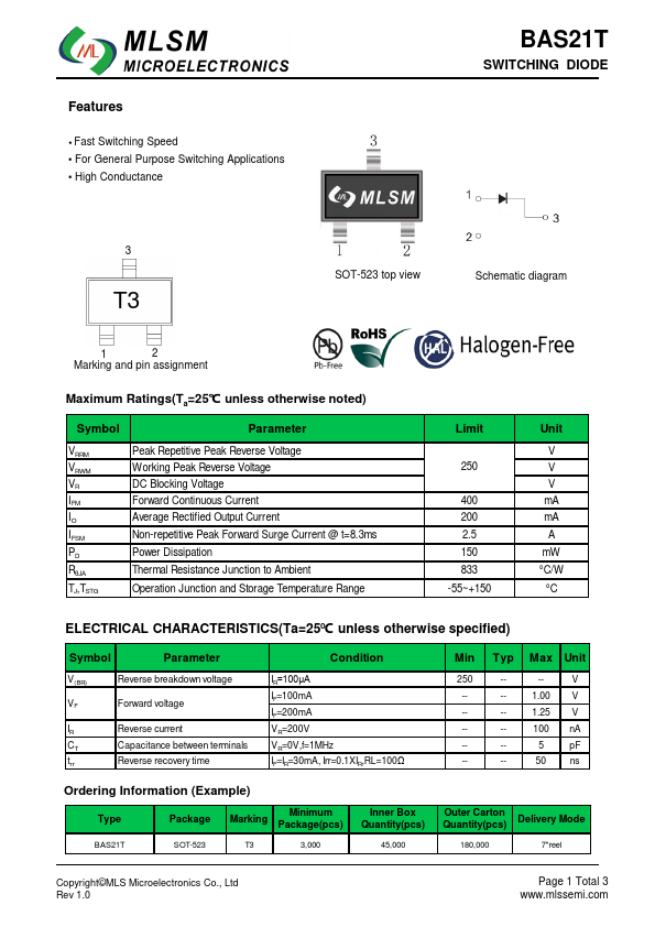Features Fast Switching Speed For General Purpose Switching Applications High Conductance BAS21T SWITCHING DIODE S1 D2 D1 3 T3 SOT-523 top view Schematic diagram 1 2 Marking and pin assignment Maximum Ratings(Ta=25℃ unless otherwise noted) Symbol Parameter.