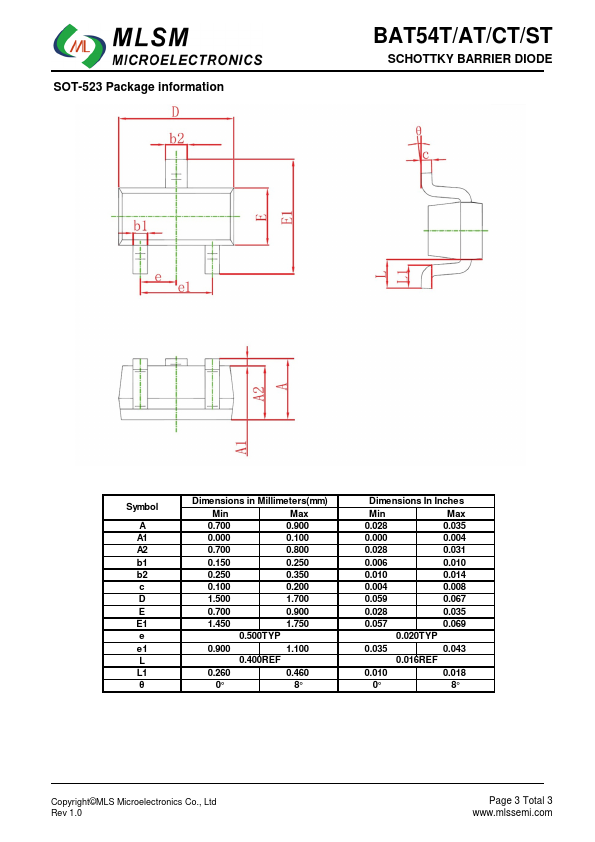 Features Low Forward Voltage Drop Fast Switching PN Junction Guard Ring for Transient and ESD Protection BAT54T BAT54AT BAT54CT BAT54T/AT/CT/ST SCHOTTKY BARRIER DIODE S1 D2 D1 BAT54ST SOT-523 top view Marking:L1 L1 Marking:L2 L2 Marking:L3 L3 Marking:L4 L4.