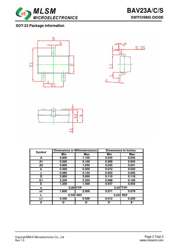 Features Fast Switching Speed High Conductance For General Purpose Switching Applications BAV23A BAV23C BAV23S Marking:KT7 KT7 Marking:KT6 KT6 Marking:KL31 KL31 BAV23A/C/S SWITCHING DIODE SOT-23 top view Maximum Ratings @Ta=25℃ unless otherwise noted Symbol.