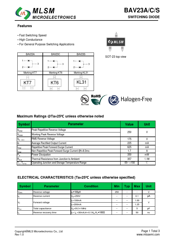 Features Fast Switching Speed High Conductance For General Purpose Switching Applications BAV23A BAV23C BAV23S Marking:KT7 KT7 Marking:KT6 KT6 Marking:KL31 KL31 BAV23A/C/S SWITCHING DIODE SOT-23 top view Maximum Ratings @Ta=25℃ unless otherwise noted Symbol.