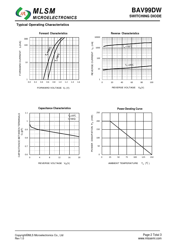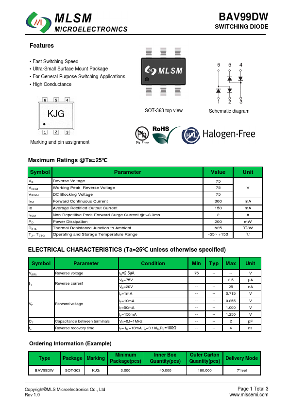 Features Fast Switching Speed Ultra-Small Surface Mount Package For General Purpose Switching Applications High Conductance KJG SOT-363 top view BAV99DW SWITCHING DIODE Schematic diagram Marking and pin assignment Maximum Ratings @Ta=25℃ Symbol Parameter VR.