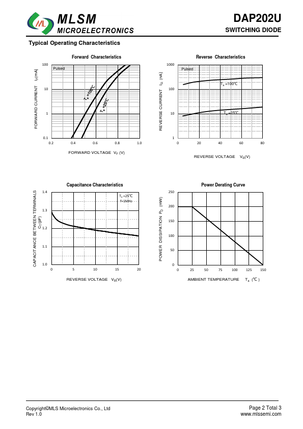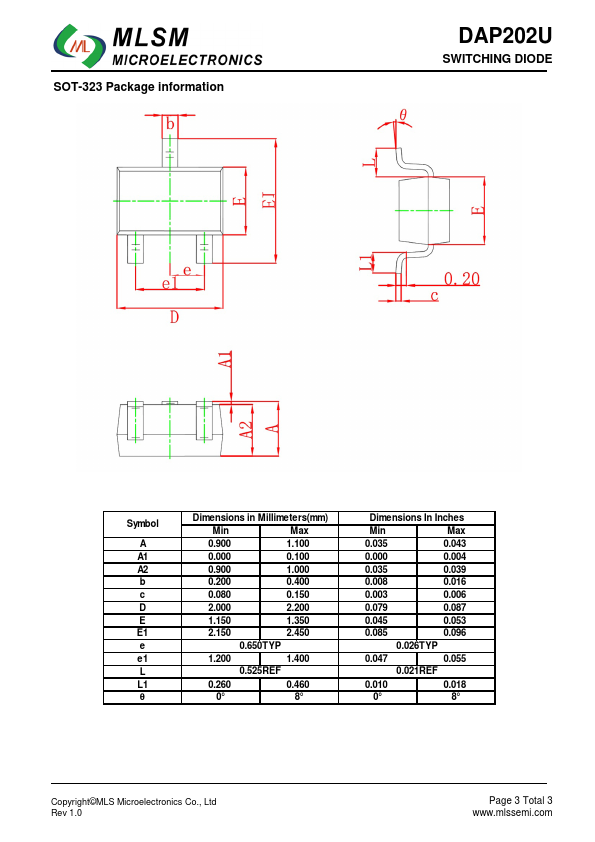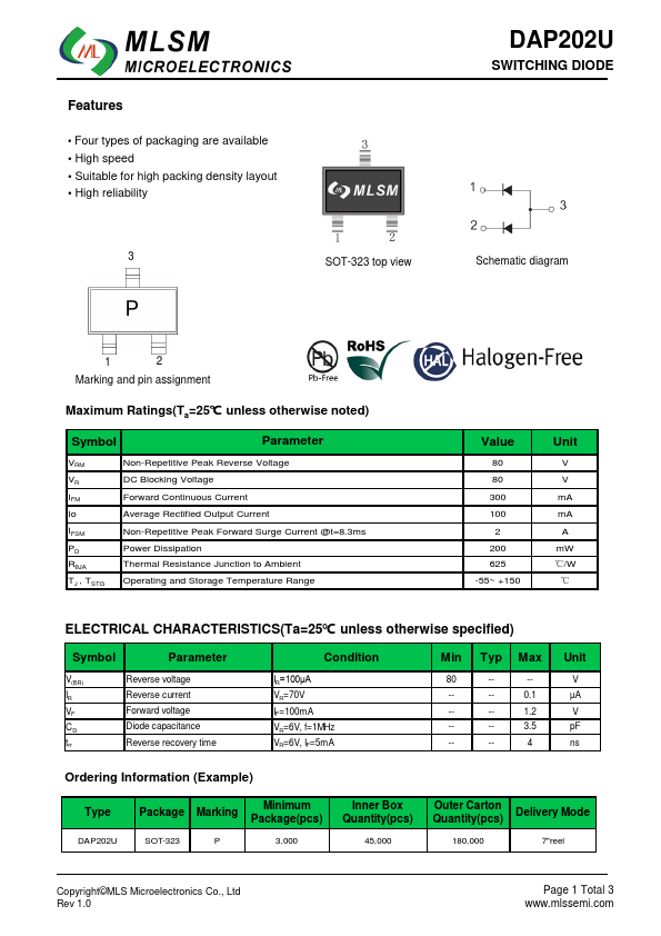 Features Four types of packaging are available High speed Suitable for high packing density layout High reliability DAP202U SWITCHING DIODE 3 SOT-323 top view Schematic diagram P 1 2 Marking and pin assignment Maximum Ratings(Ta=25℃ unless otherwise noted).