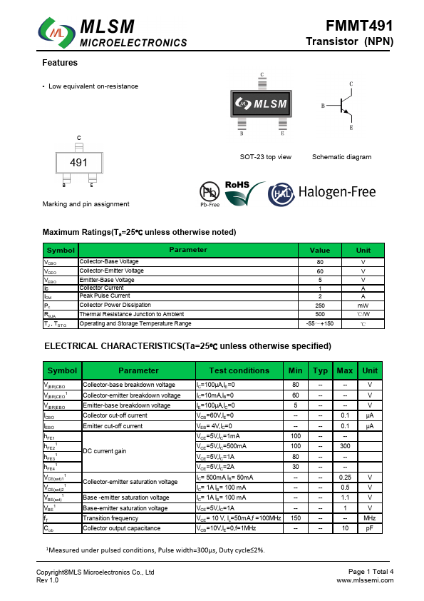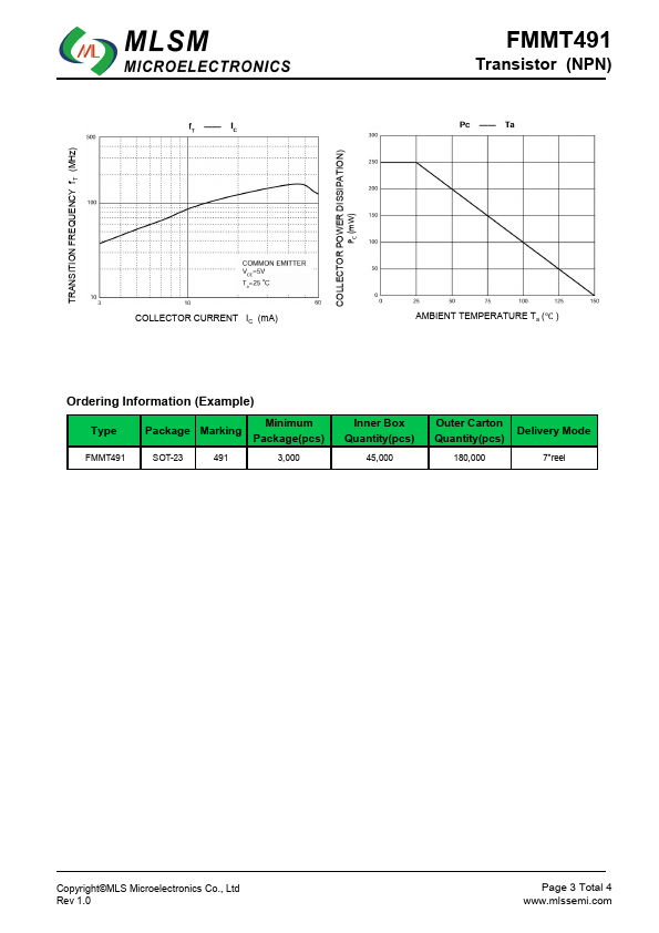 Copyright©MLS Microelectronics Co., Ltd Rev 1.0 Page 1 Total 4 .mlssemi. Typical Operating Characteristics FMMT491 Transistor (NPN) DC CURRENT GAIN hFE COLLECTOR CURRENT IC (mA) COLLECTOR-EMITTER VOLTAGE VCE (V) COLLECTOR CURRENT IC (mA) BASE-EMITTER SATURATION VOLTAGE VBEsat (mV) COLLECTOR CURREMT IC (mA) COLLECTOR CURREMT IC (mA) COLLECTOR-EMITTER SATURATION VOLTAGE VCEsat (mV) CAPACITANCE C (pF) COLLECTOR CURRENT...