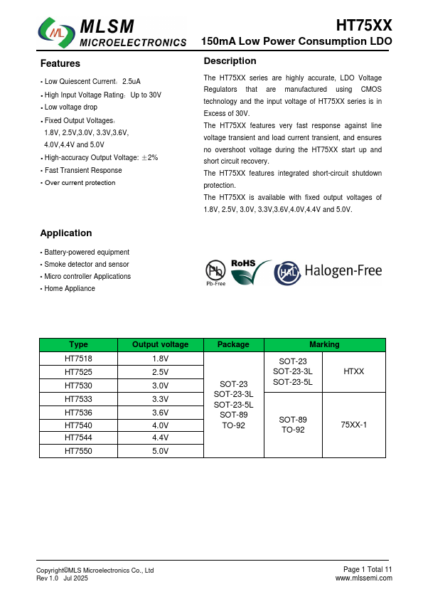 The HT75XX series are highly accurate, LDO Voltage Regulators that are manufactSu1reD2d using CMOS technology and the input voltagDe1of HT75XX series is in Excess of 30V.