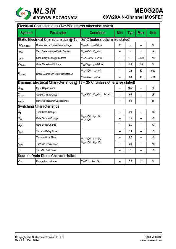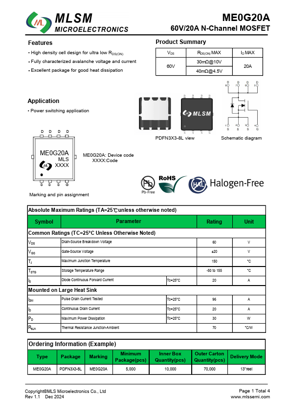 Features High density cell design for ultra low RDS(ON) Fully characterized avalanche voltage and current Excellent package for good heat dissipation ME0G20A 60V/20A N-Channel MOSFET Product Summary VDS RDS(ON) MAX 60V 30mΩ@1S01VD2 40mΩ@D14.5V ID MAX 20A.