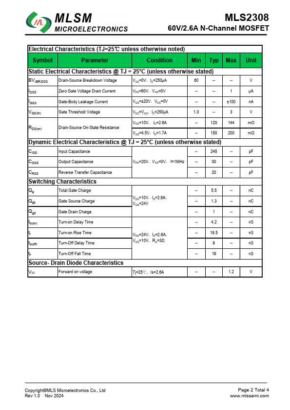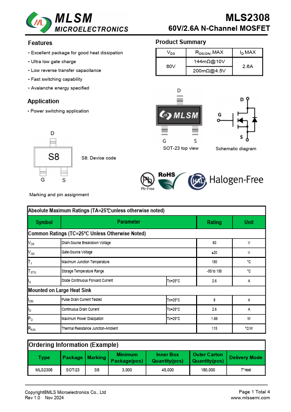Features Excellent package for good heat dissipation Ultra low gate charge Low reverse transfer capacitance Fast switching capability Avalanche energy specified Application Power switching application MLS2308 60V/2.6A N-Channel MOSFET Product Summary VDS 60V.
