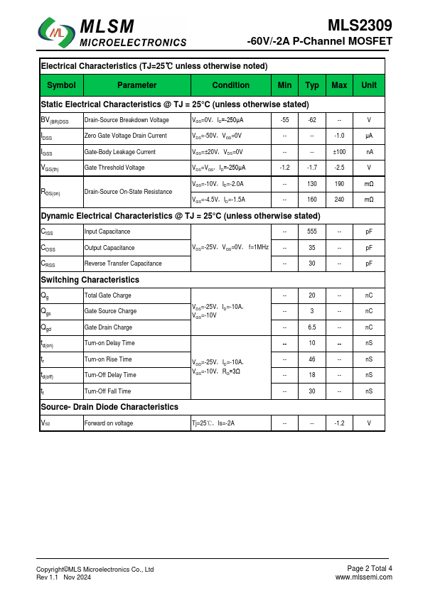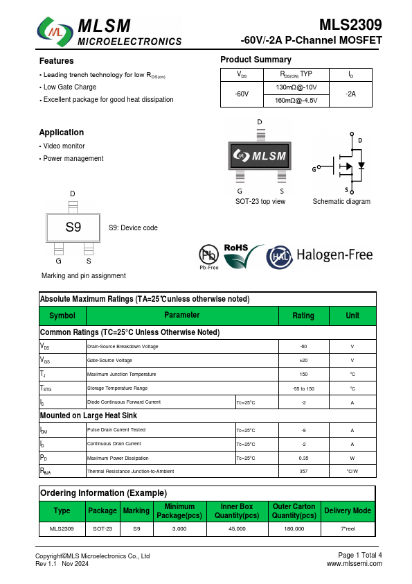 Features Leading trench technology for low RDS(on) Low Gate Charge Excellent package for good heat dissipation Application Video monitor Power management MLS2309 -60V/-2A P-Channel MOSFET Product Summary VDS RDS(ON) TYP ID -60V 130mΩ@-S110DV2 -2A 160mΩD@1.