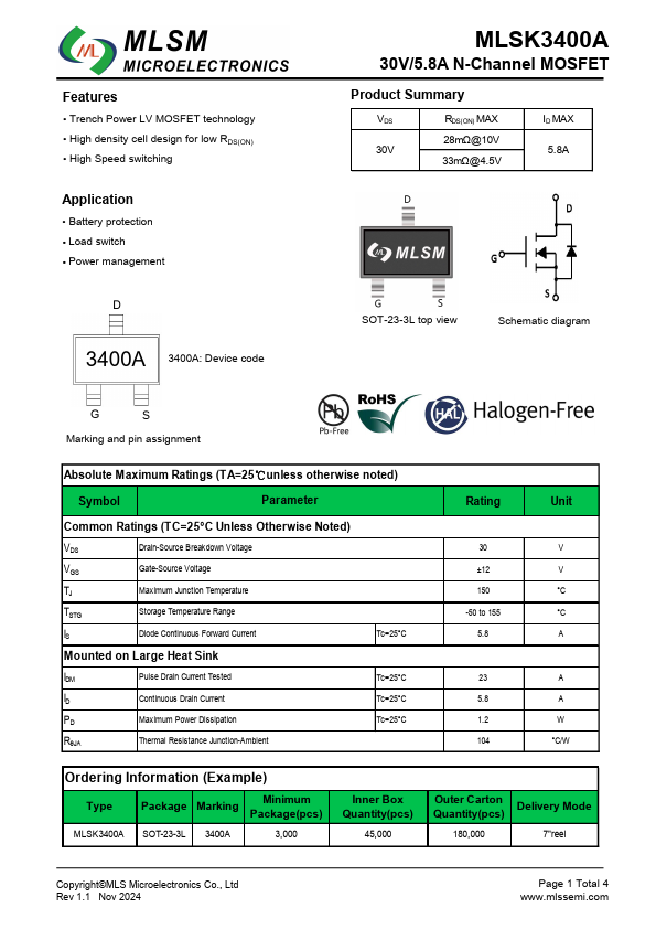 Features Trench Power LV MOSFET technology High density cell design for low RDS(ON) High Speed switching Application Battery protection Load switch Power management D 3400A 3400A:.