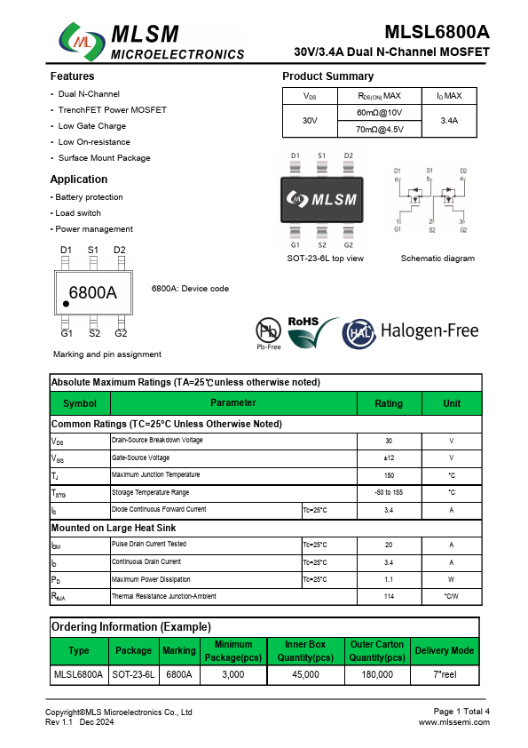 MLSL6800A is 30V/3.4A Dual N-Channel MOSFET manufactured by MLS Microelectronics.