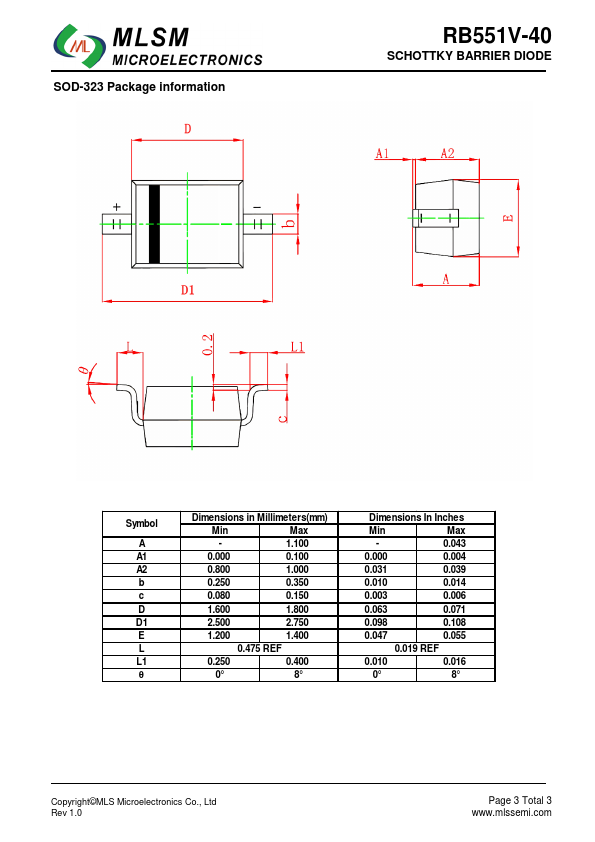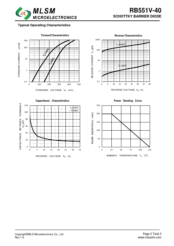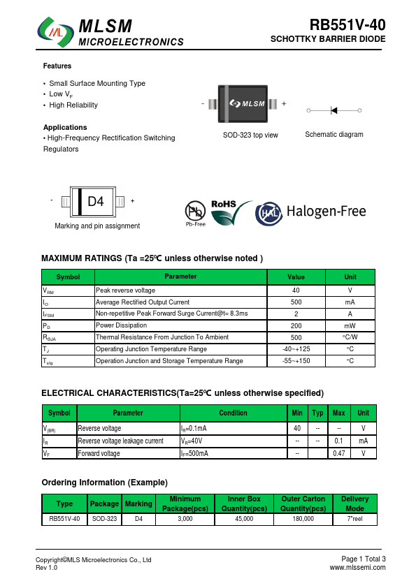 Features Small Surface Mounting Type Low VF High Reliability Applications High-Frequency Rectification Switching Regulators RB551V-40 SCHOTTKY BARRIER DIODE D2 D1 SOD-323 top view Schematic diagram - D4 + Marking and pin assignment MAXIMUM RATINGS (Ta =25℃.