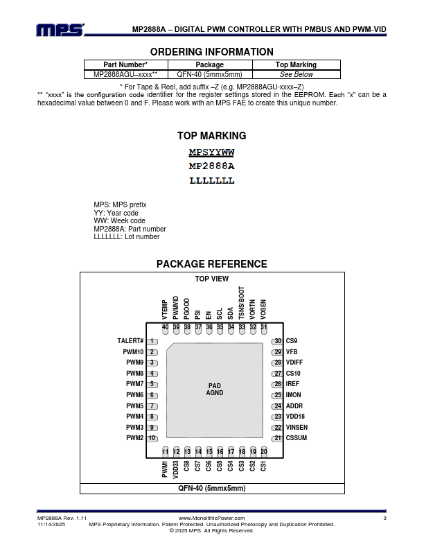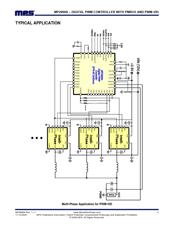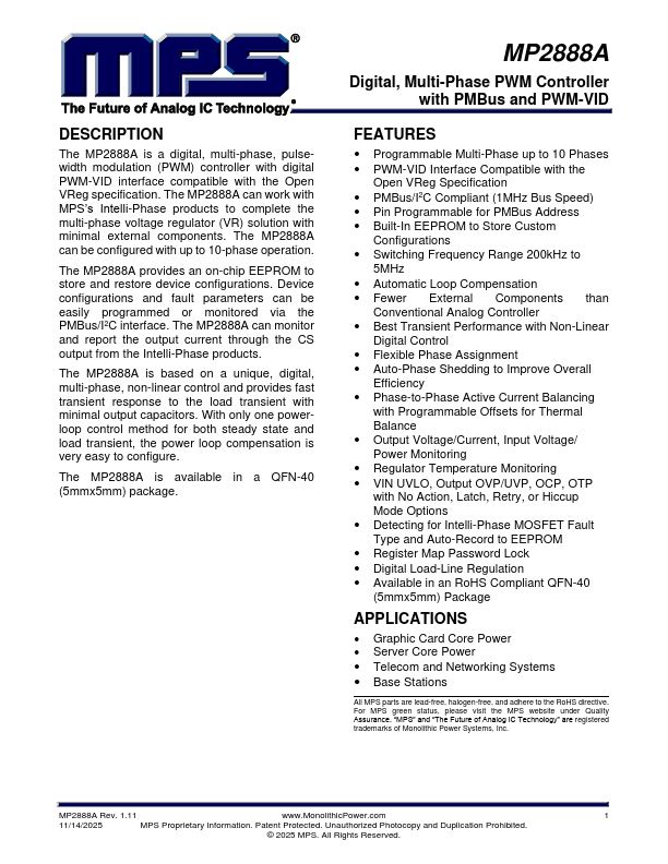 The MP2888A is a digital, multi-phase, pulsewidth modulation (PWM) controller with digital PWM-VID interface patible with the Open VReg specification. The MP2888A can work with MPS’s Intelli-Phase products to plete the multi-phase voltage regulator (VR) solution with minimal external ponents. The MP2888A can be configured with up to 10-phase operation.