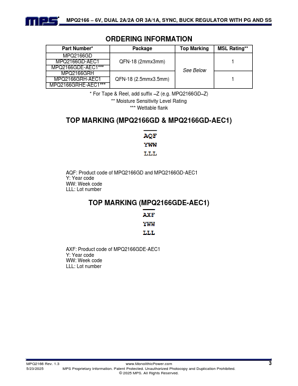 The MPQ2166 is an internally compensated, dual, PWM, synchronous, step-down regulator that operates from a 2.7V to 6V input and generates an output voltage as low as 0.6V. The MPQ2166 can be configured as a 2A/2A or 3A/1A output current regulator and is ideal for powering portable equipment that runs on a single-cell lithium-ion (Li+) battery due to a low 60µA quiescent current.
