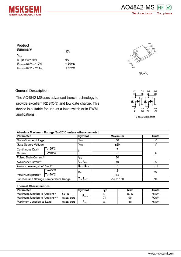 The AO4842-MSuses advanced trench technology to provide excellent RDS(ON) and low gate charge. This device is suitable for use as a load switch or in PWM applications.
