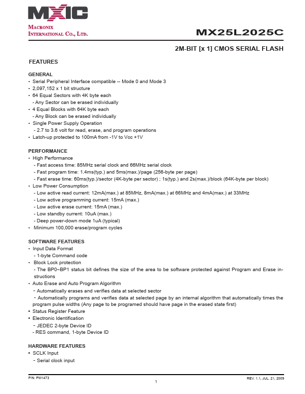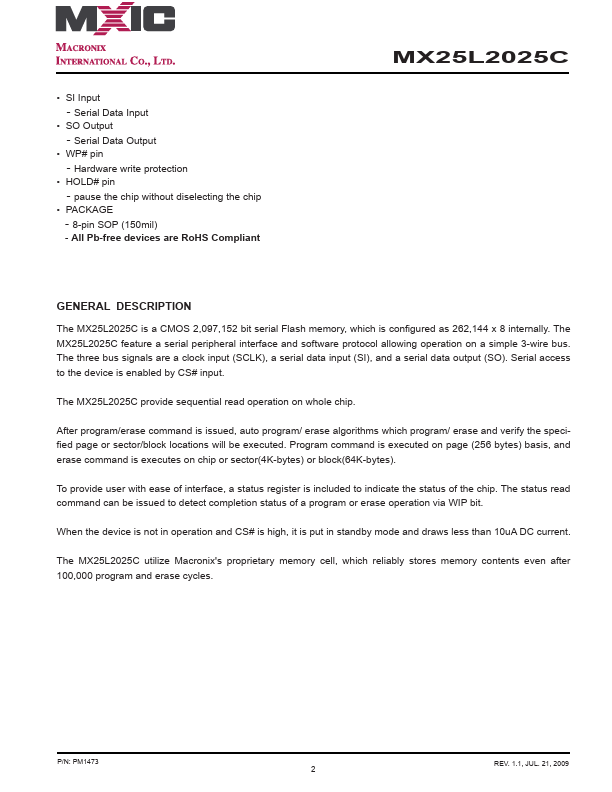The MX25L2025C is a CMOS 2,097,152 bit serial Flash memory, which is configured as 262,144 x 8 internally.