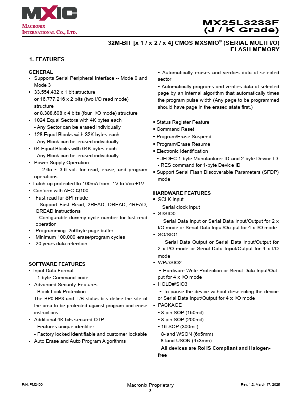 MX25L3233F (J / K Grade) MX25L3233F- J/K Grade 3V, 32M-BIT [x 1/x 2/x 4] CMOS MXSMIO® (SERIAL MULTI I/O) FLASH MEMORY.
