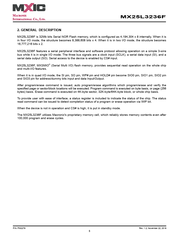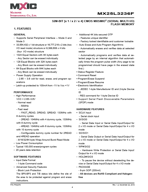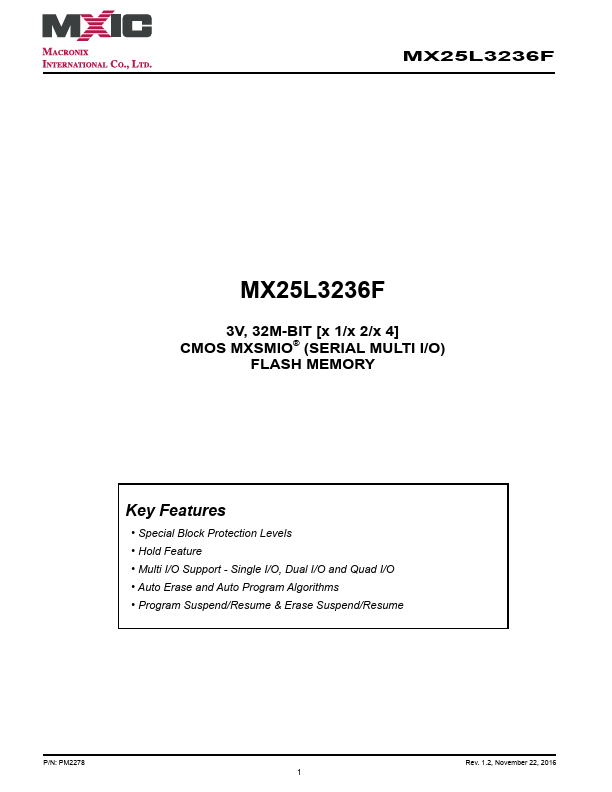 MX25L3236F MX25L3236F 3V, 32M-BIT [x 1/x 2/x 4] CMOS MXSMIO® (SERIAL MULTI I/O) FLASH.