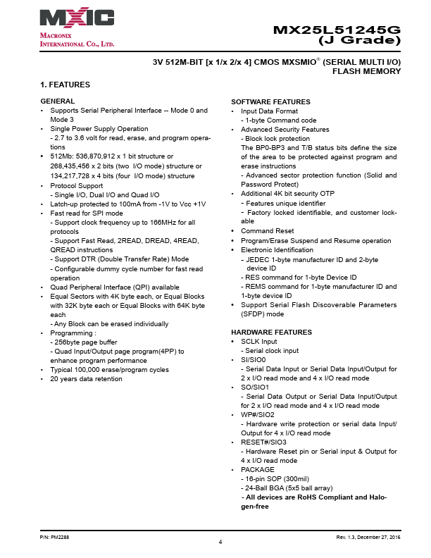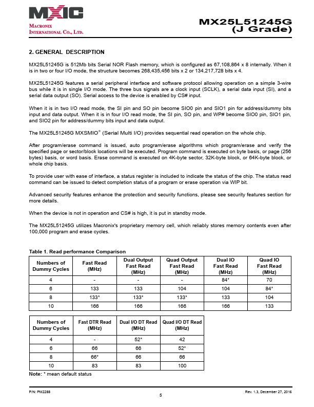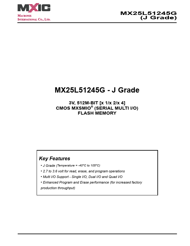 MX25L51245G is 512Mb bits Serial NOR Flash memory, which is configured as 67,108,864 x 8 internally. When it is in two or four I/O mode, the structure bees 268,435,456.