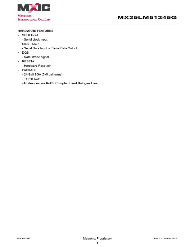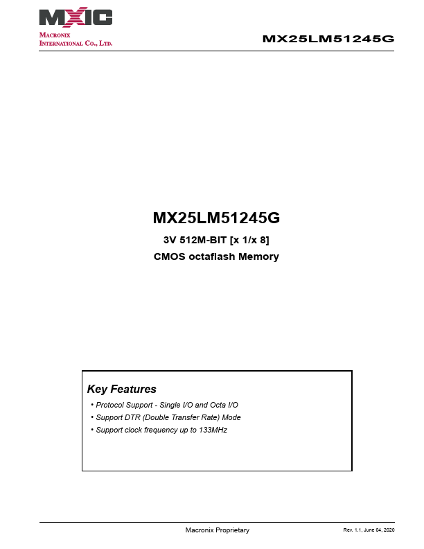 MX25LM51245G is 512Mb bits Octal interface Serial NOR Flash memory, which is configured as 67,108,864 x 8 internally.