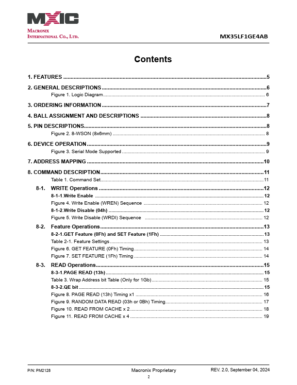 S................................................................................................................6 Figure 1. Logic Diagram......................................................................................................................... 6 3. ORDERING INFORMATION................................................................................................................7 4. BALL ASSIGNMENT AND DESCRIPTIONS......................................................................................8 5. PIN DESCRIPTIONS...........................................................................................................................8 Figure 2. 8-WSON (8x6mm).................................................................................................................. 8 6. DEVICE...