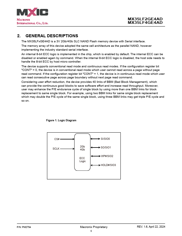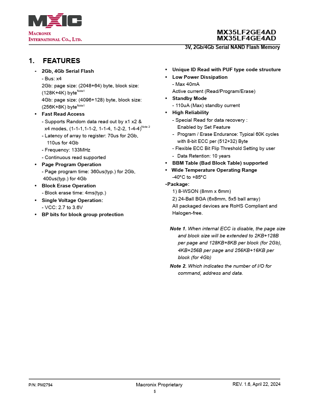 MX35LF2GE4AD MX35LF4GE4AD 2G-bit/4G-bit Serial NAND Flash Memory MX35LFxGE4AD P/N: PM2794 Macronix Proprietary 1 REV.