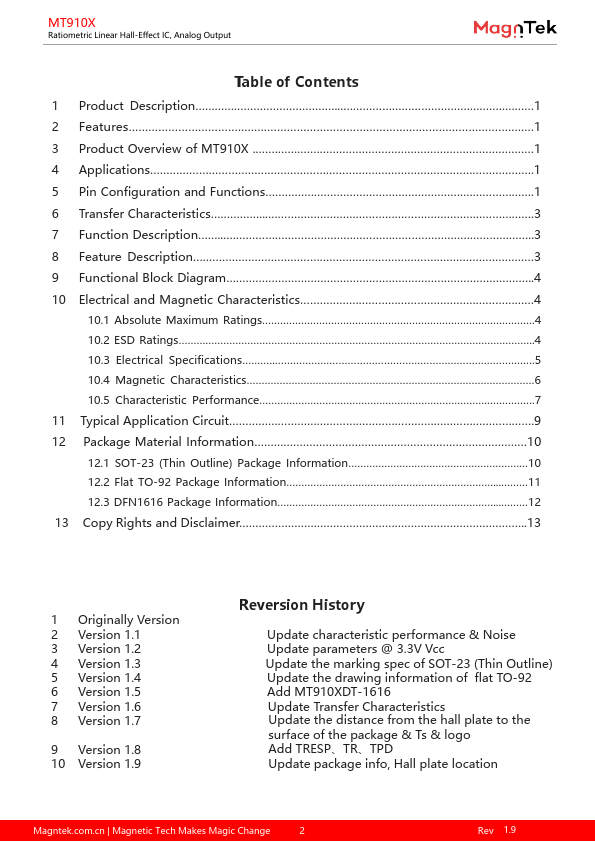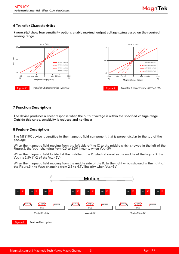 The MT910X device is a linear Hall effect IC that responds proportionally to magnetic flux density. The device can be used for accurate position sensing in a wide range of applications. The device operates from 3.0V to 5.5V power supplies.