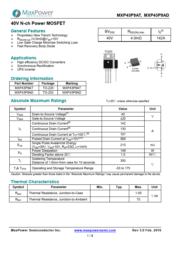 | MXP4002AFL | 40V N-ch Power MOSFET |