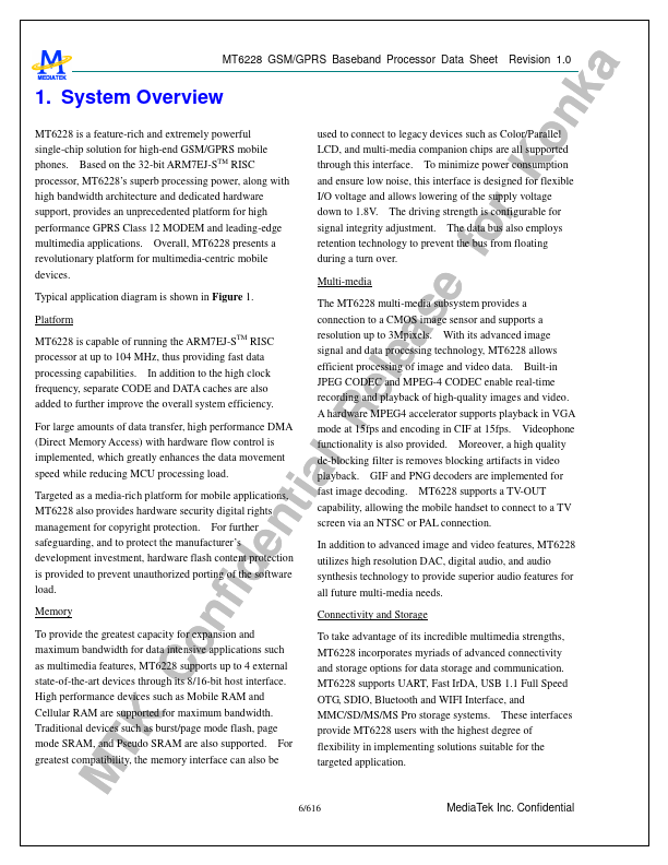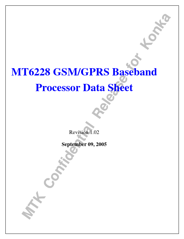 MTK Confidential Release for Konka .DataSheet.co.kr MT6228 GSM/GPRS Baseband Processor Data Sheet Revision 1.02 September 09, 2005 Datasheet pdf - http://..net/ MTK Confidential Release for Konka .DataSheet.co.kr MT6228 GSM/GPRS Baseband Processor Data Sheet Revision 1.0 1. System Overview MT6228 is.