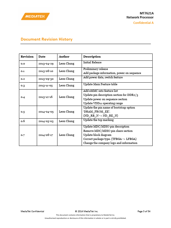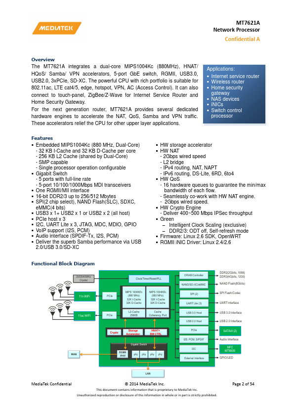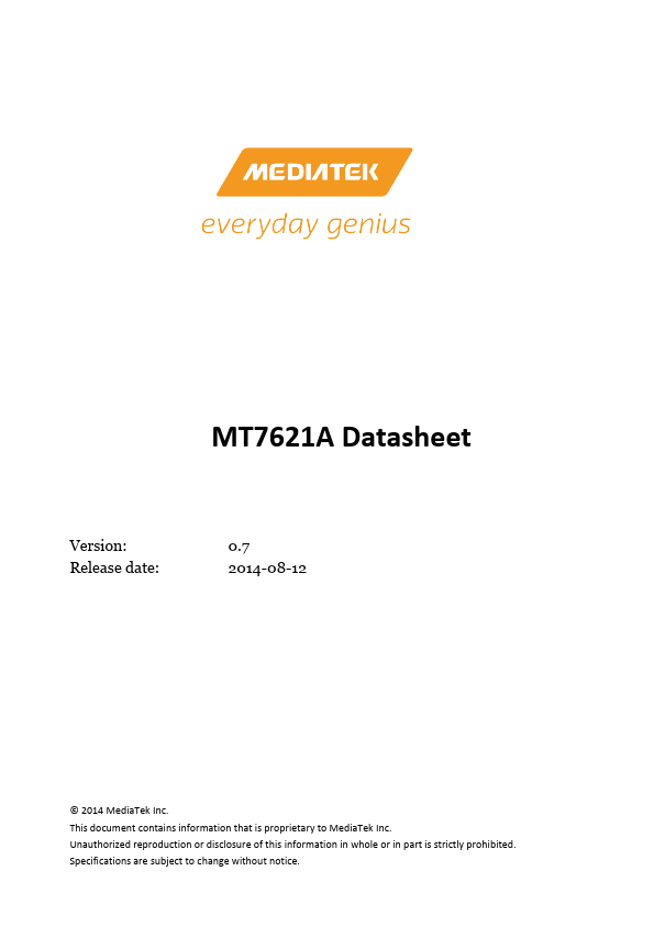 MT7621A Datasheet Version: 0.7 2014-08-12 © 2014 MediaTek Inc. This document contains information that is proprietary to MediaTek Inc.
