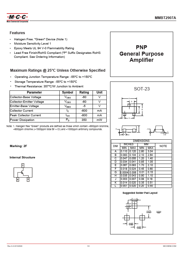 • Operating Junction Temperature Range: -55℃ to +150℃ • Storage Temperature Range: -55℃ to +150℃ • Thermal Resistance: 357℃/W Junction to Ambient
