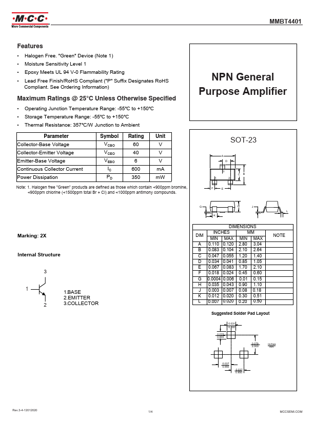 • Operating Junction Temperature Range: -55℃ to +150℃ • Storage Temperature Range: -55℃ to +150℃ • Thermal Resistance: 357℃/W Junction to Ambient