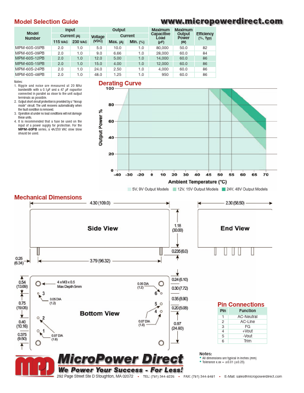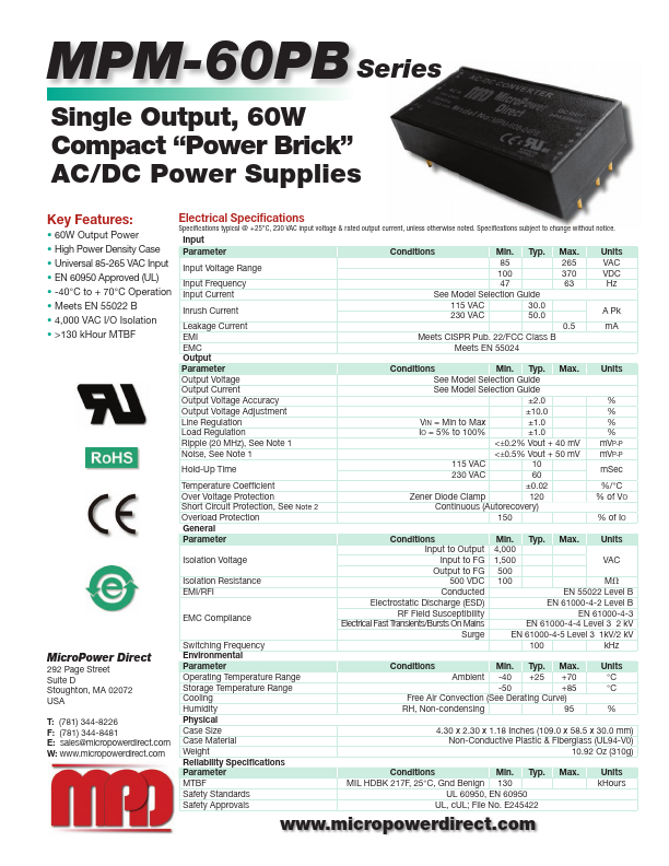 MPM-60PB Series Single Output, 60W pact “Power Brick” AC/DC Power Supplies.