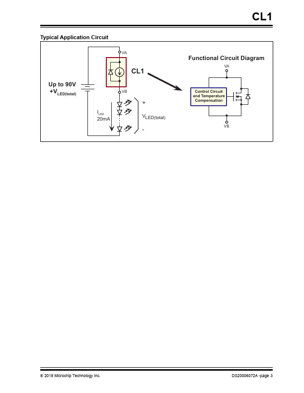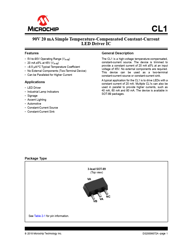 The CL1 is a high-voltage temperature-pensated, constant-current source. The device is trimmed to provide a constant current of 20 mA ±5% at an input voltage of 45V. No external ponents are required.