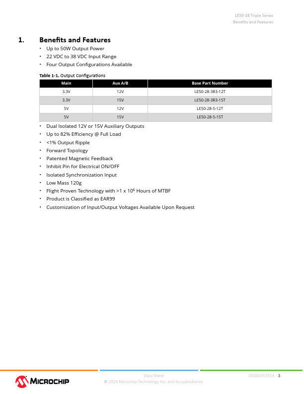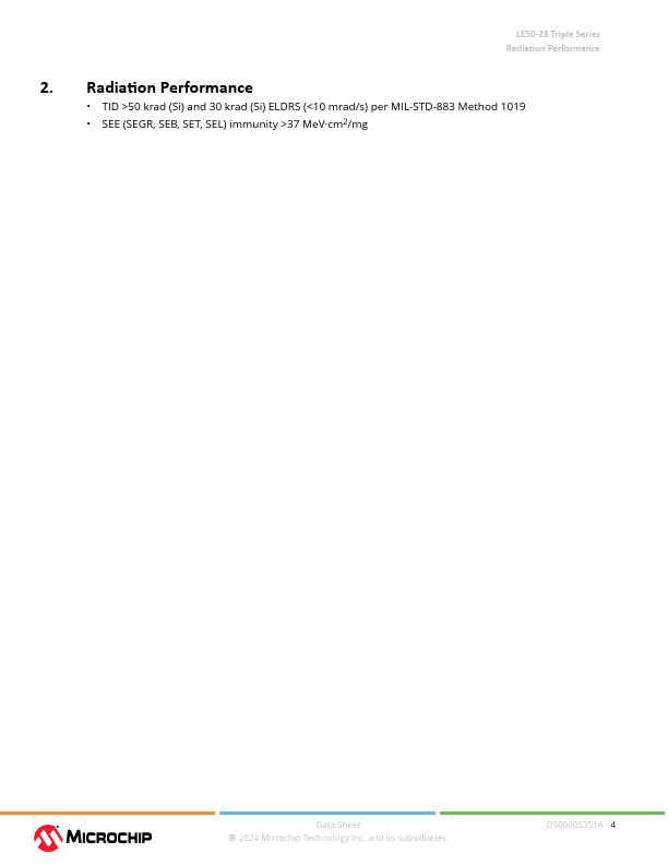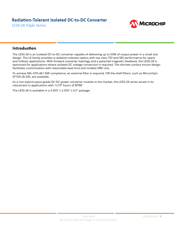 Radiation-Tolerant Isolated DC-to-DC Converter LE50-28 Triple Series Introduction The LE50-28 is an isolated DC-to-DC converter capable of delivering up to 50W of output power in a small size design. The LE family provides a radiation-tolerant option with top class TID and SEE performance for space and military applications. With forward converter topology and a patented magnetic feedback, the LE50-28 is optimized...